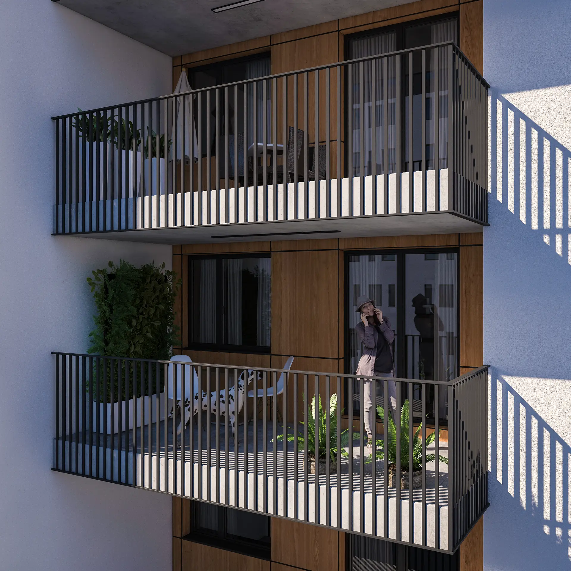 Budynek zostanie wykonany w standardzie obejmujący m.in. wykończenie klatek schodowych w prostym, ale nowoczesnym stylu – obejmujące m.in. eleganckie portale wind, lustra, ciche windy obsługujące również parking podziemny, plac zabaw oraz zielone tereny zewnętrzne.