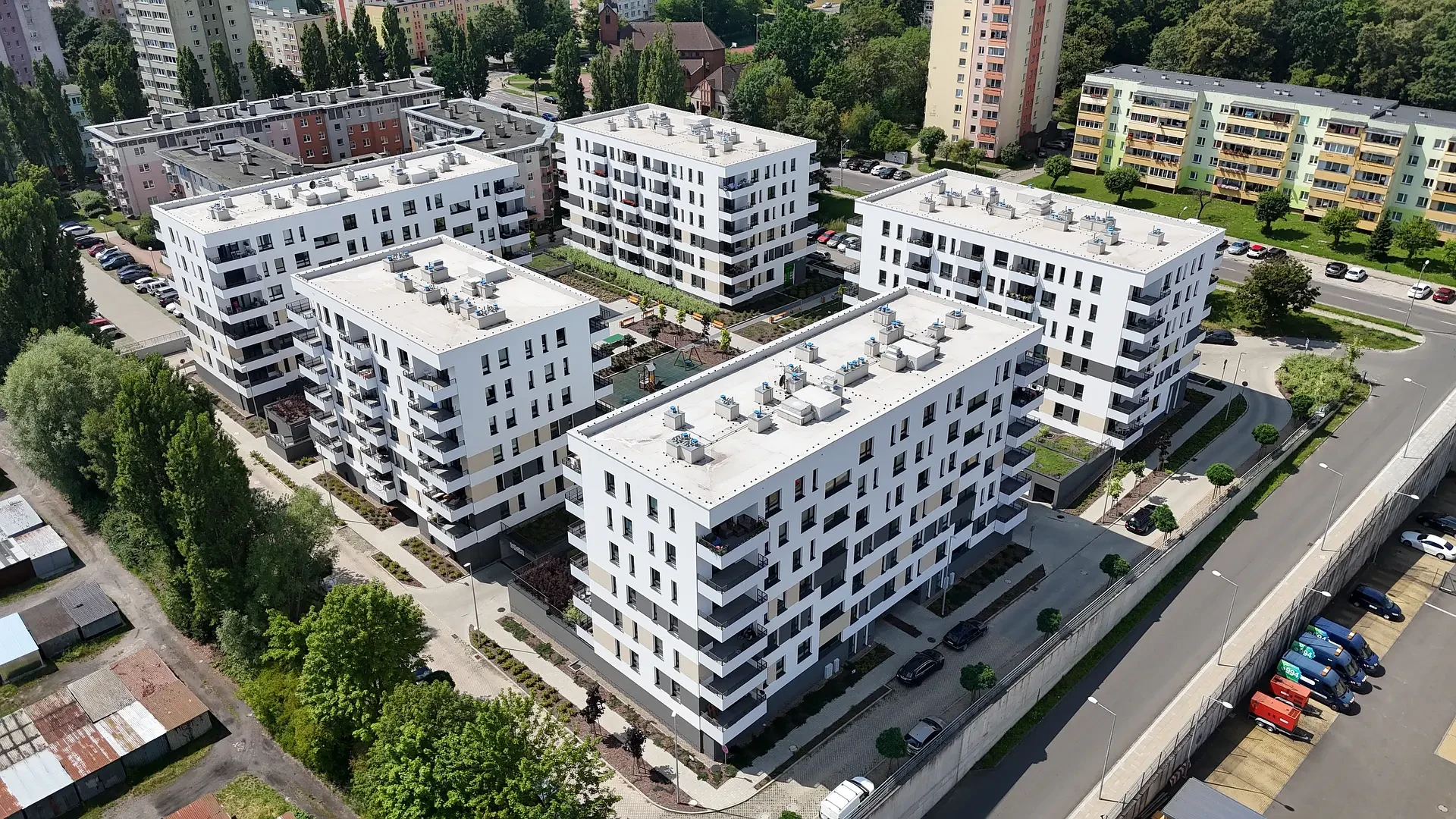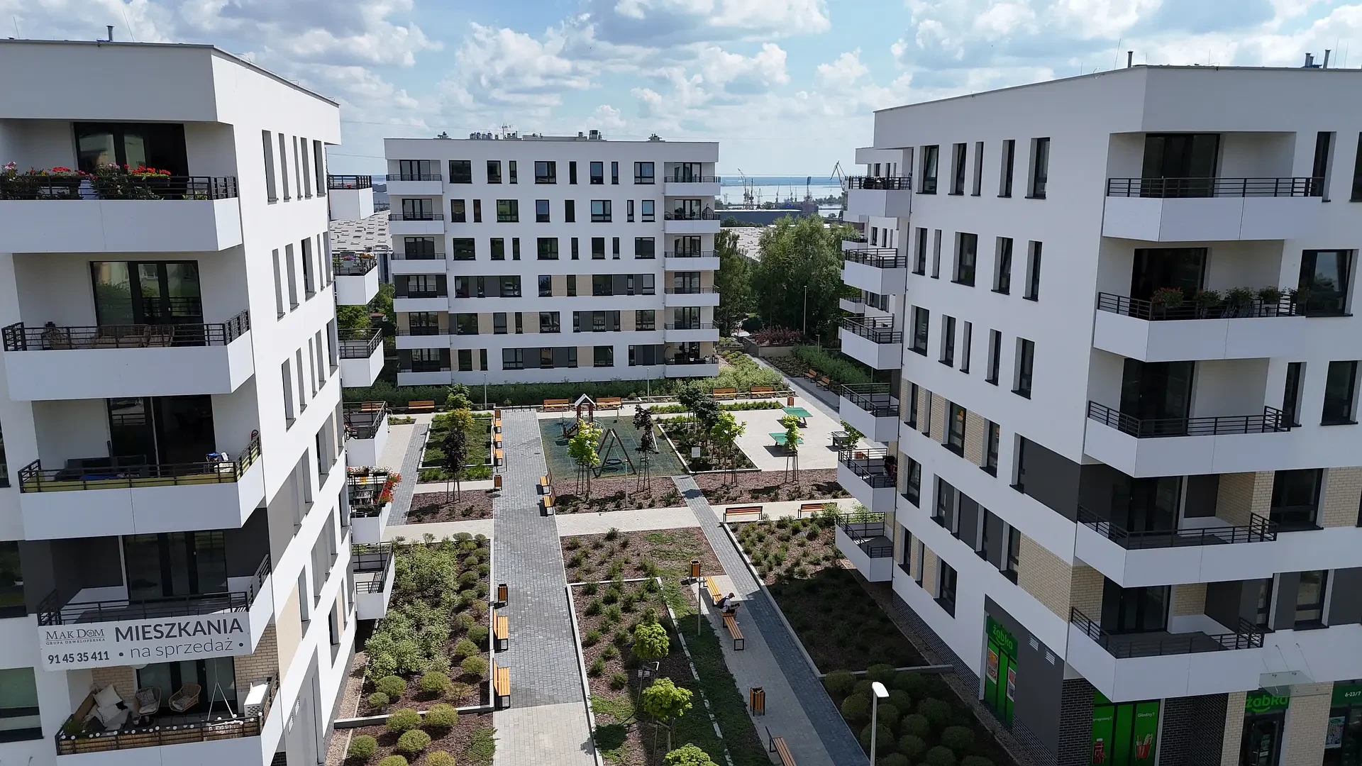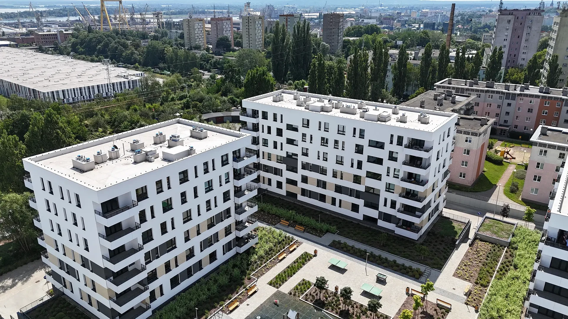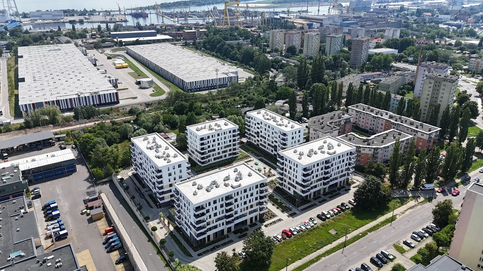 Duże odległości między budynkami zapewniają przyjazne, pełne światła, miejsce do życia. Widok na jezioro Dąbie i stoczniowe dźwigi dopełniają wyjątkowy charakter inwestycji tworząc klimatyczne miejsce do życia.
