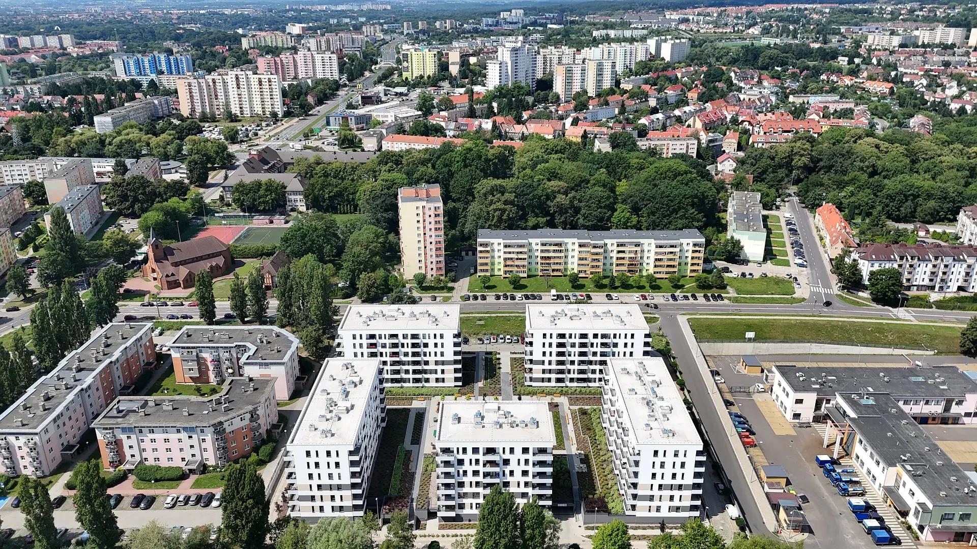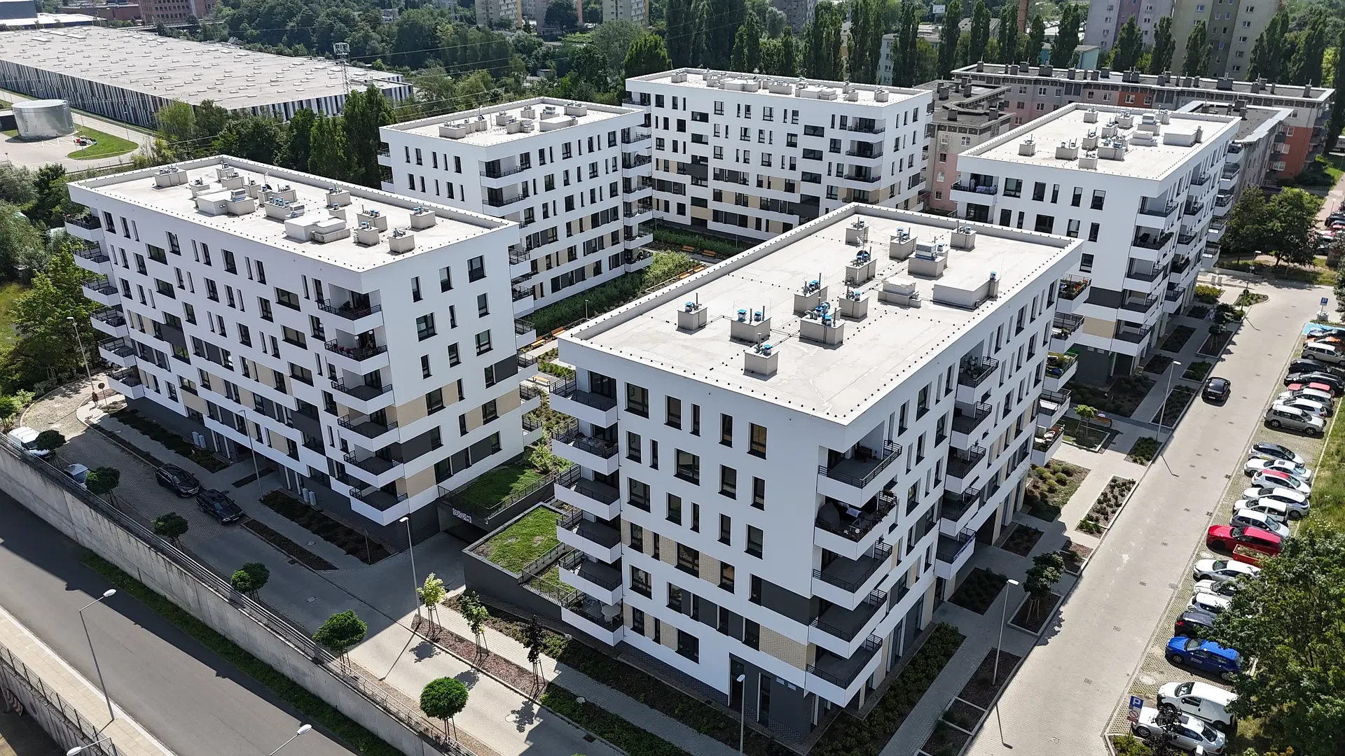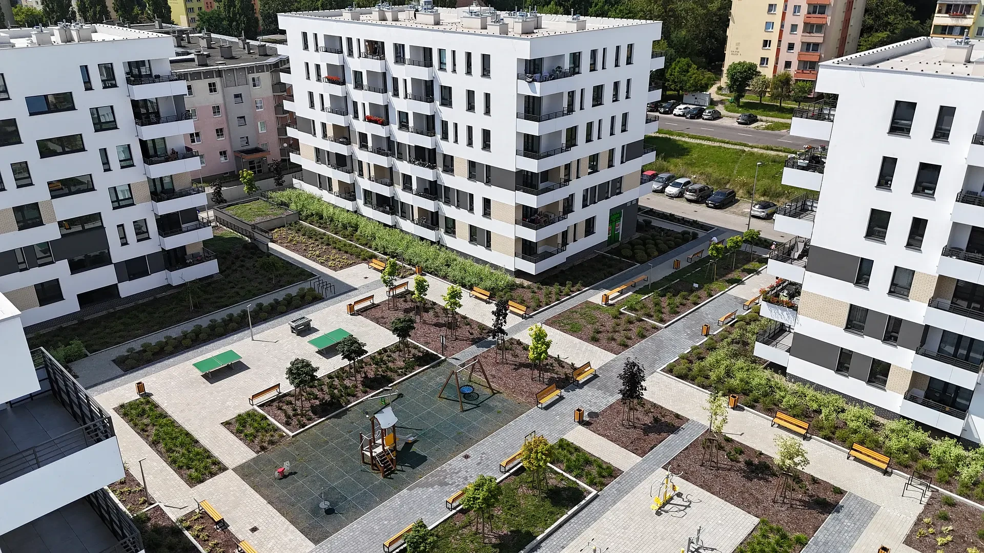 Duże odległości między budynkami zapewniają przyjazne, pełne światła, miejsce do życia. Widok na jezioro Dąbie i stoczniowe dźwigi dopełniają wyjątkowy charakter inwestycji tworząc klimatyczne miejsce do życia.