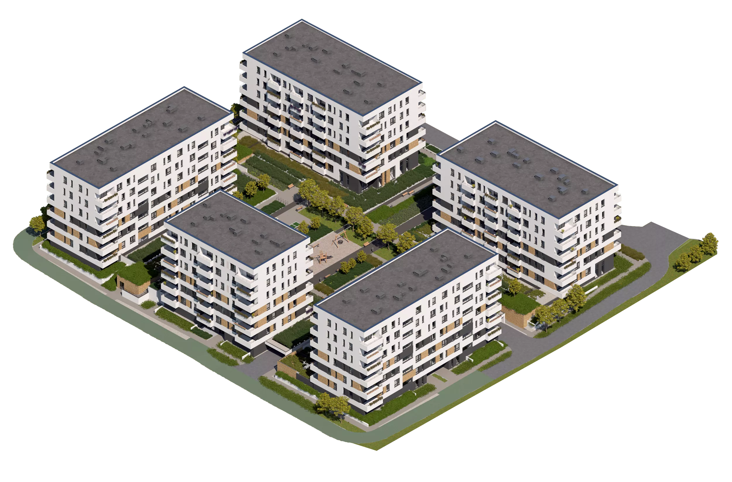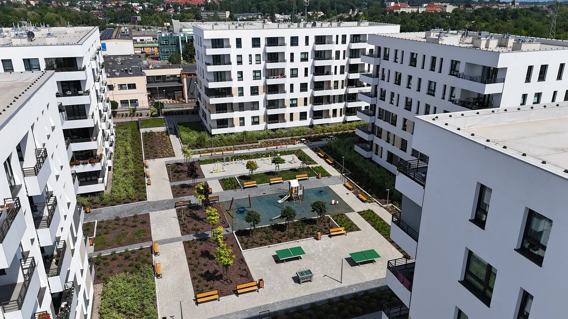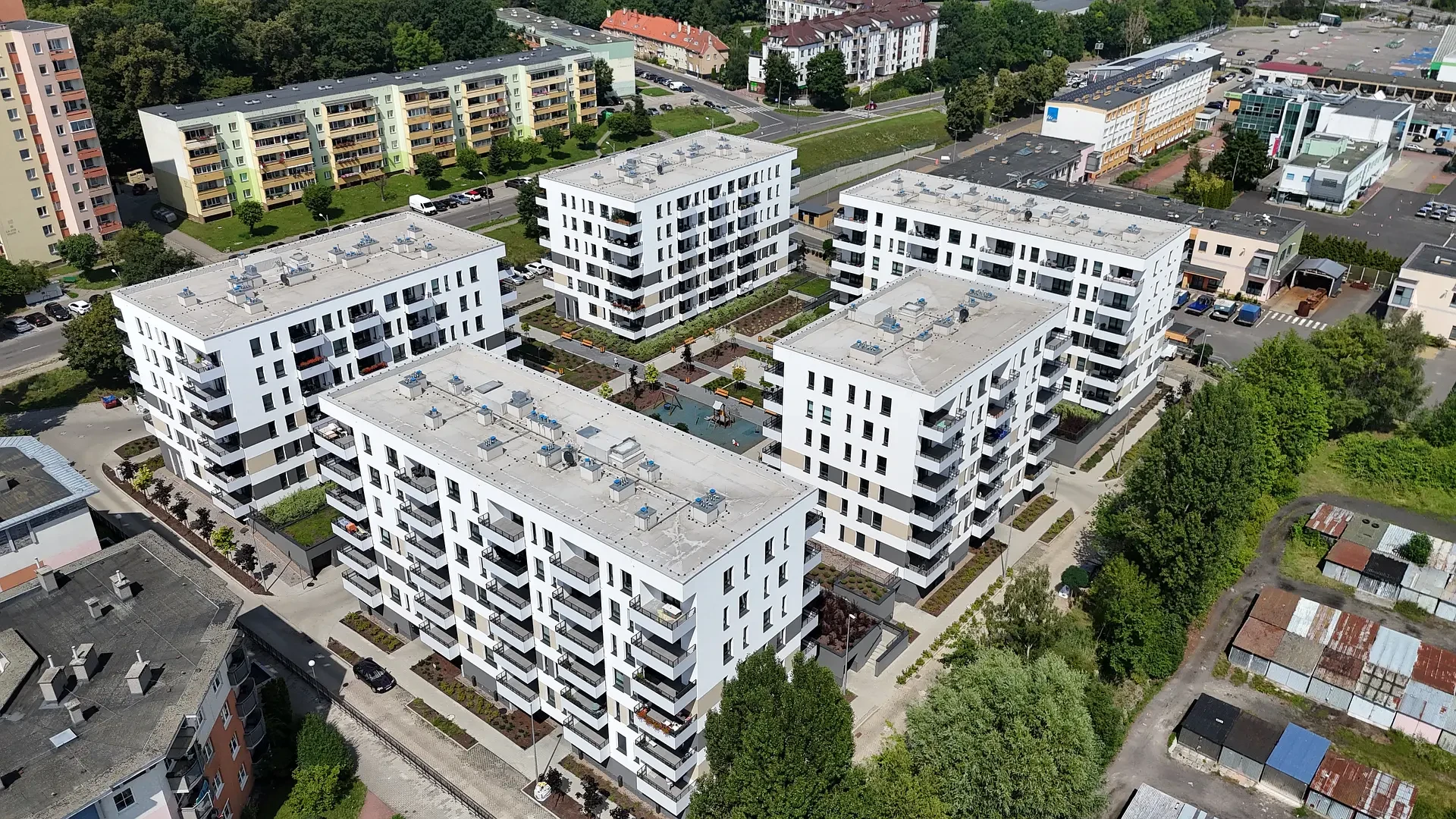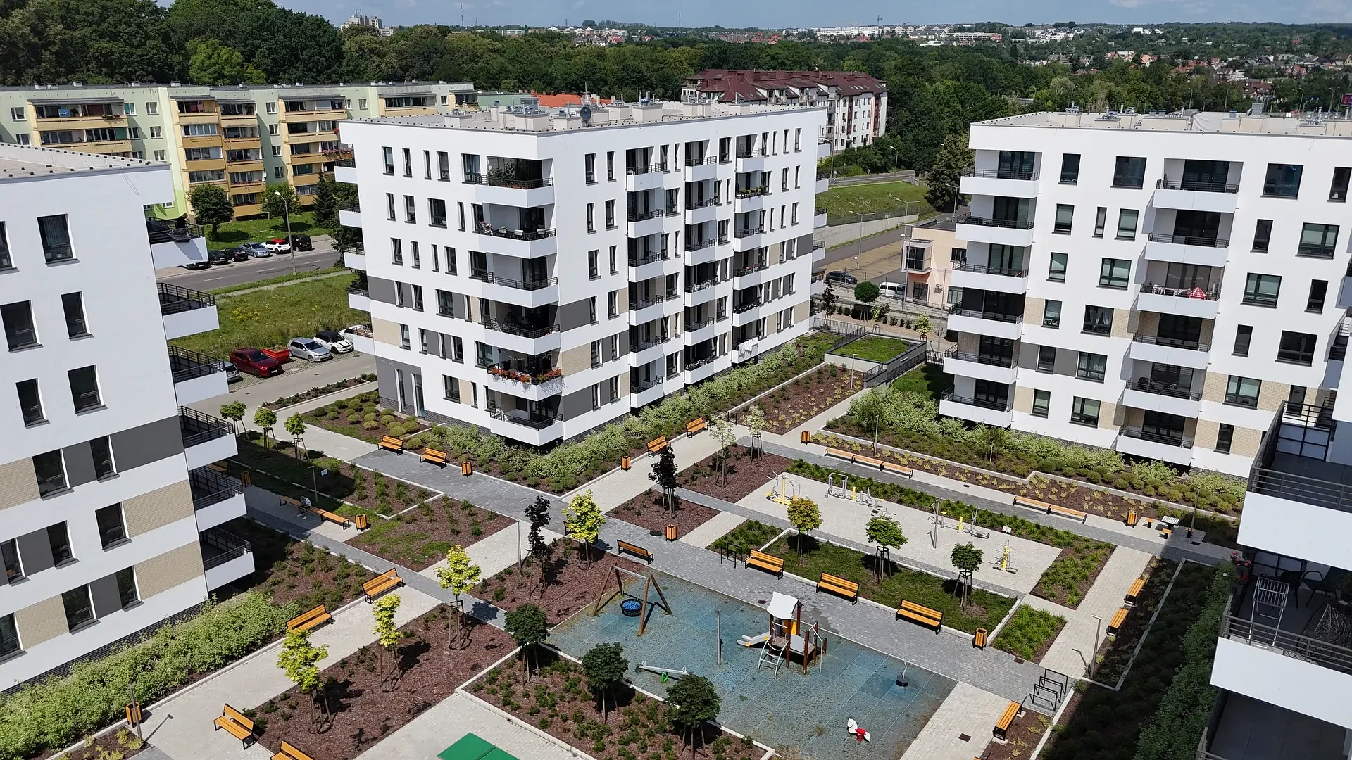 Duże odległości między budynkami zapewniają przyjazne, pełne światła, miejsce do życia. Widok na jezioro Dąbie i stoczniowe dźwigi dopełniają wyjątkowy charakter inwestycji tworząc klimatyczne miejsce do życia.