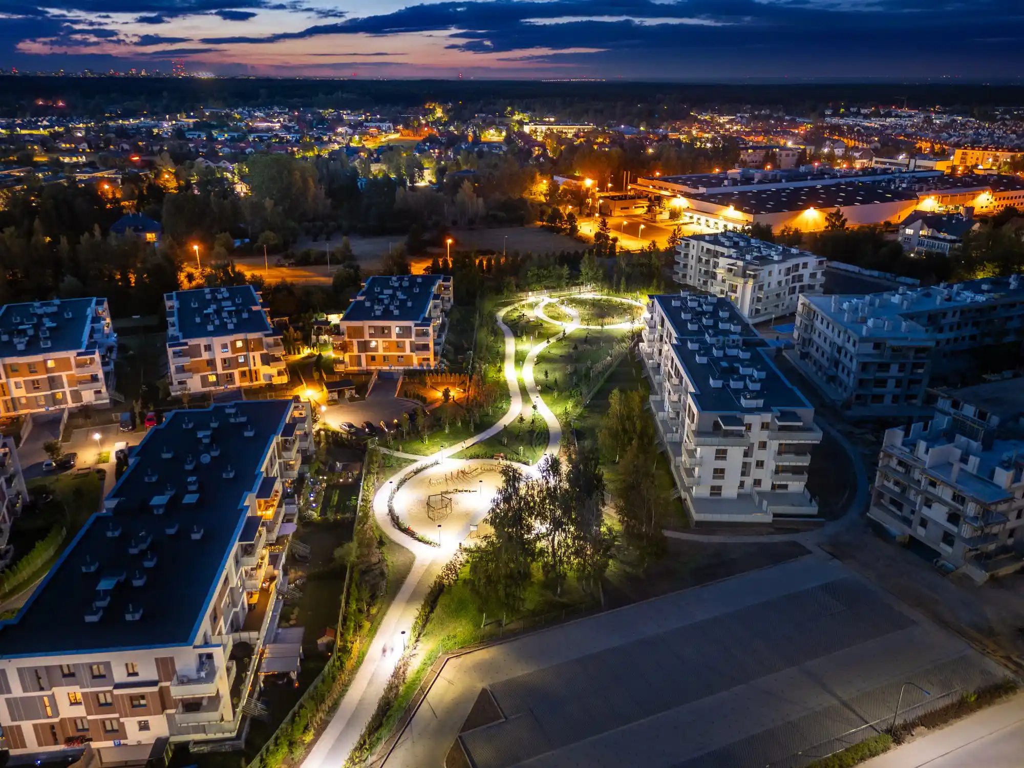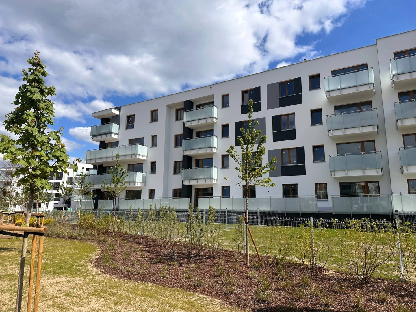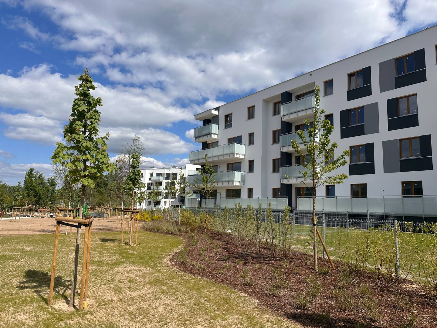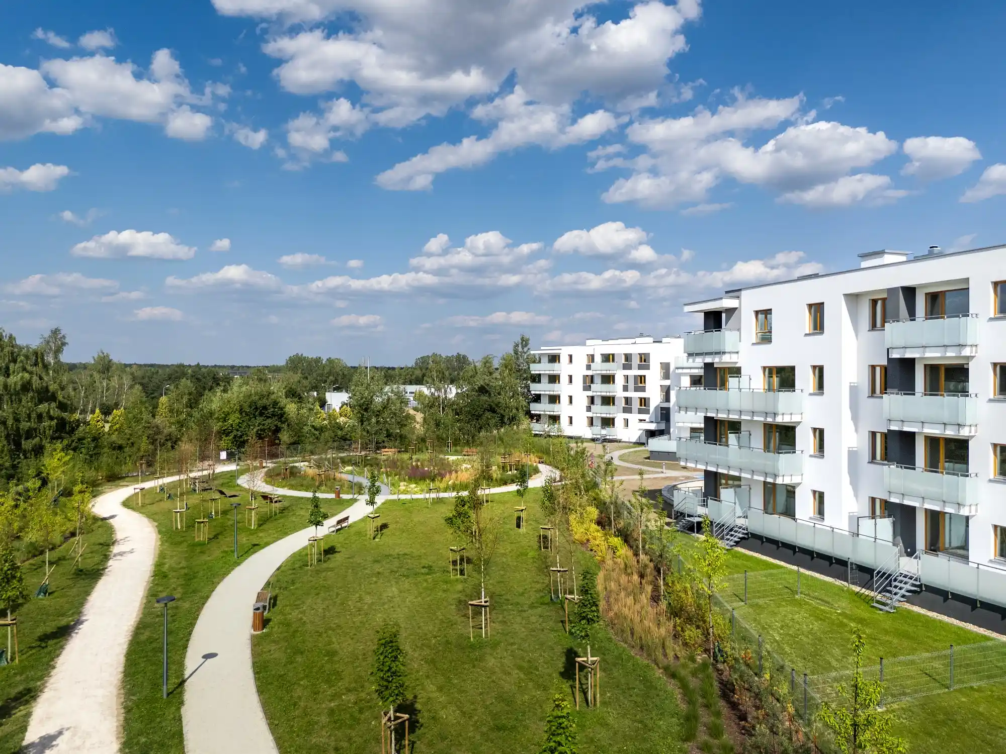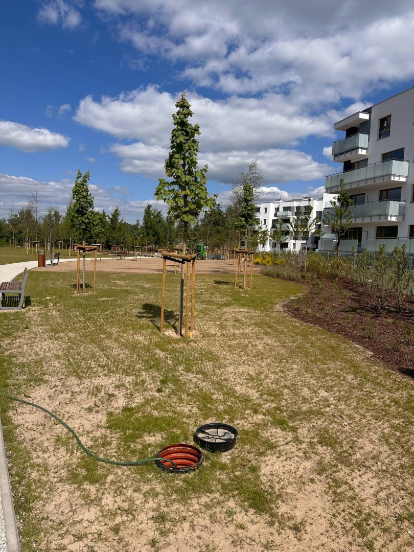 Szczególnym atutem osiedla jest bezpośrednie sąsiedztwo nowego parku – miejsca stworzonego z myślą o odpoczynku i rekreacji. Znajduje się tam nowoczesny plac zabaw, leżanki, ławki oraz bogata, zróżnicowana roślinność: drzewa, krzewy, trawy ozdobne i ogród wilgociolubny. Osoby ceniące kontakt z przyrodą docenią też możliwość spacerów do pobliskiego Lasu Kabackiego, oddalonego zaledwie o 15 minut.