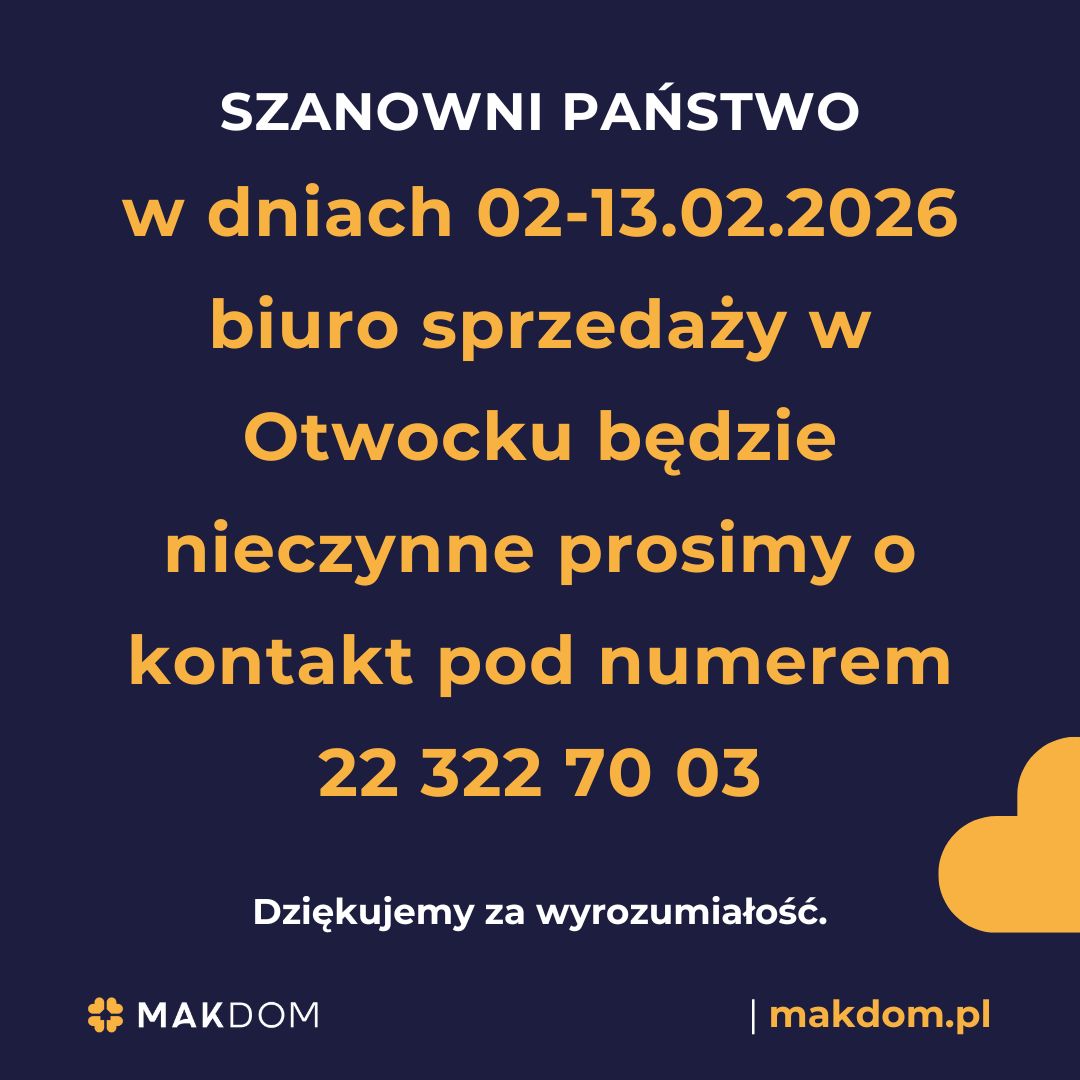 SZANOWNI PAŃSTWO W DNIACH 02-13.02 Biuro sprzedaży w Otwocku będzie nieczynne prosimy o kontakt pod numerem 22 322 70 03.